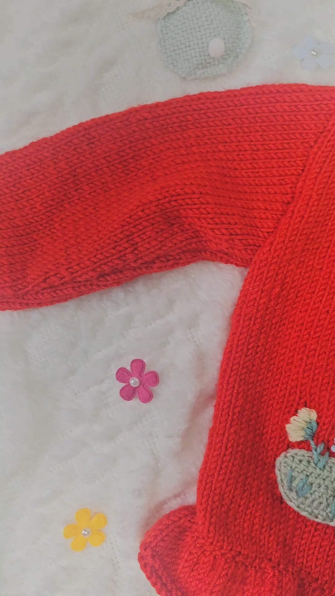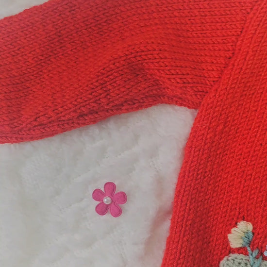 Hand-knitted in the happiest cherry red and finished with the sweetest hand-crocheted bunny holding a bundle of heart balloons, this cardigan is made for cosy cuddles, park walks and all those tiny, everyday moments that end up meaning the most.