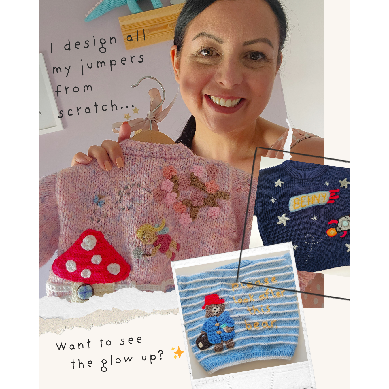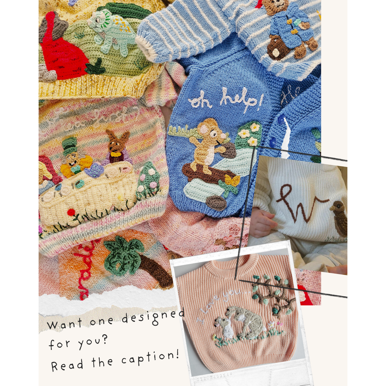 3) I will reach out to you via email to discuss your design**, colour preferences and final pricing. Don't worry, if you have a budget in mind, this will be factored into the design. I can help with inspiration too if needed. I can provide the knit - from one of my fabulous hand knitters (up to age 8 years) - or you can send in your own. This will be discussed and priced when discussing your order.
