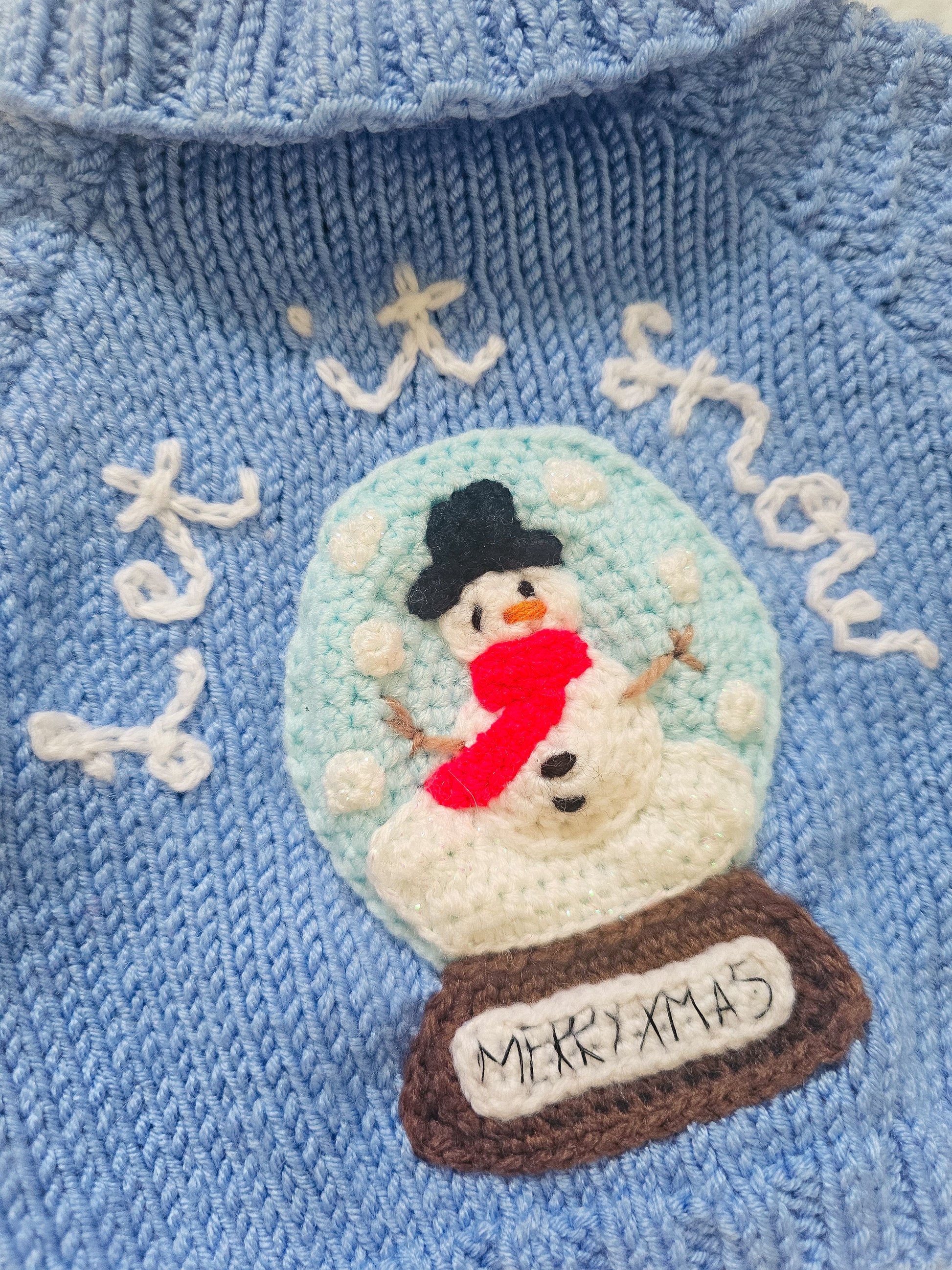 On the back, a hand-crocheted snow globe takes centre stage — featuring a cheerful snowman wrapped in a bright scarf, surrounded by falling snow. The words “Let it snow” are hand-embroidered around the globe, making this piece feel like a tiny winter scene brought to life in yarn.