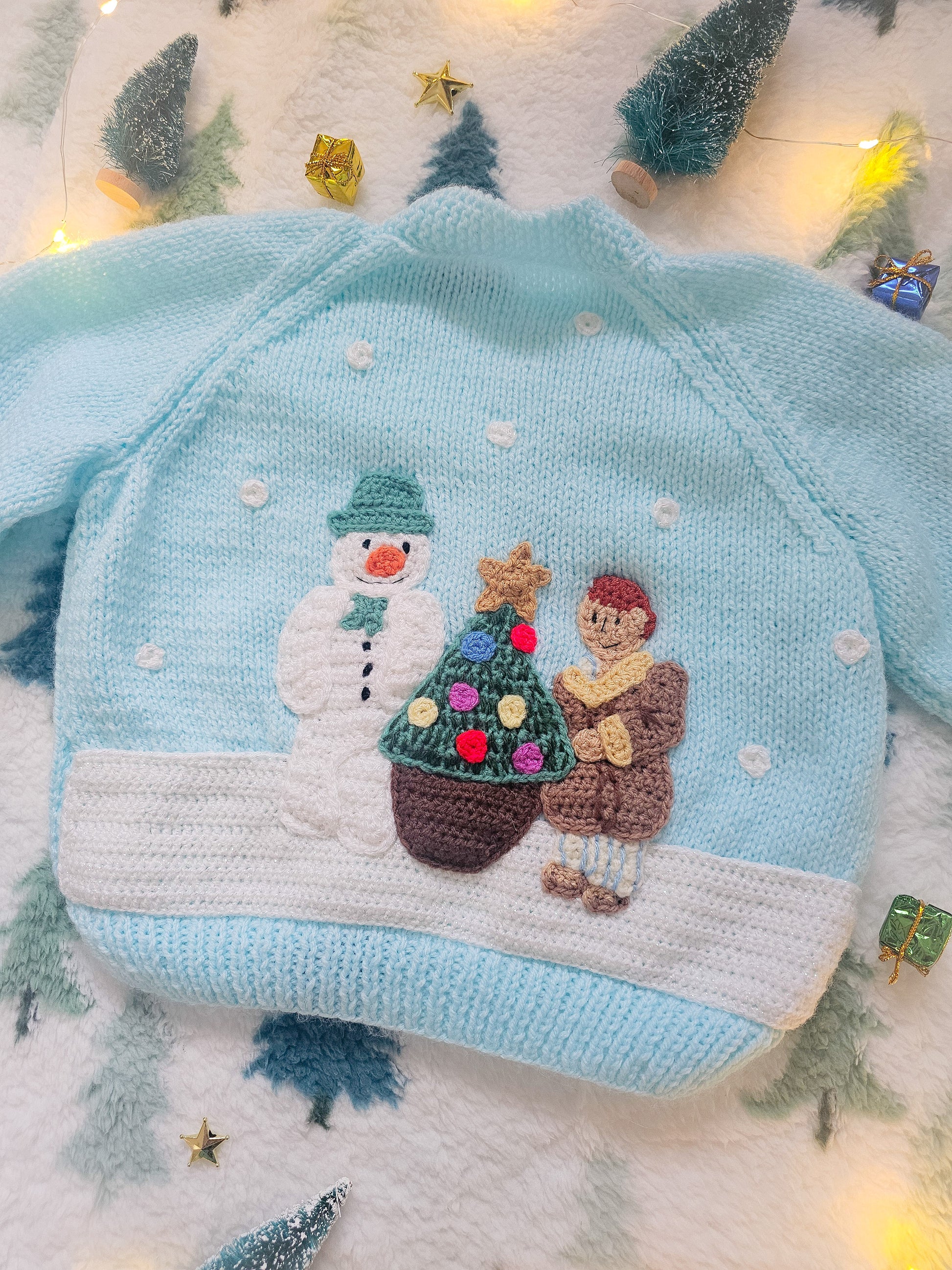This cosy baby-blue cardigan is beautifully soft and wintery, knitted in a gentle frosty shade that makes the perfect backdrop for the scene on the back. Each element — from the sparkling Snowman to the little boy beside him — is hand-crocheted with care and full of charming detail.